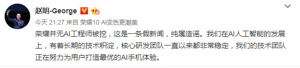 对此,荣耀总裁赵明在微博上辟谣称,荣耀并无AI工程师被挖,“这是一条假新闻,纯属造谣。”